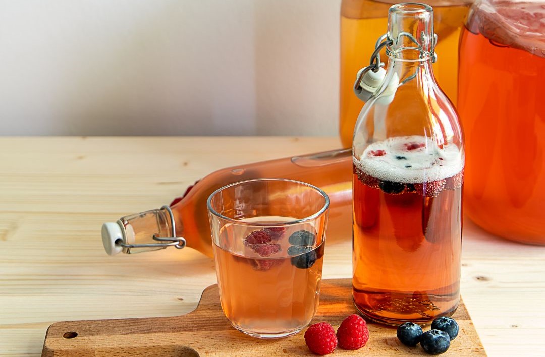 O kombucha é uma bebida fermentada produzida a partir de chás como o chá verde e chá preto em conjunto do iogurte kefir, contendo uma colônia de bactérias e leveduras, denominada scoby, que gera a fermentação.